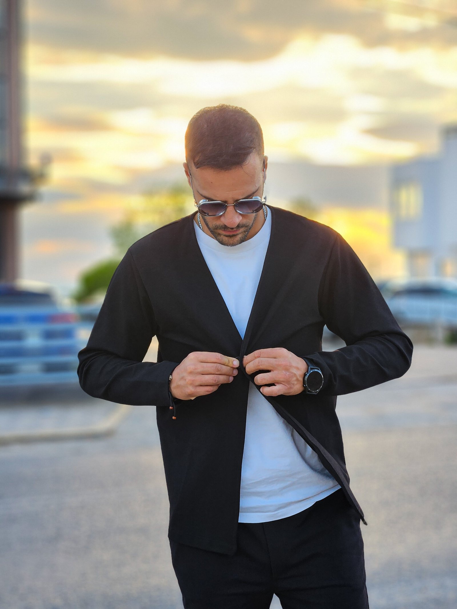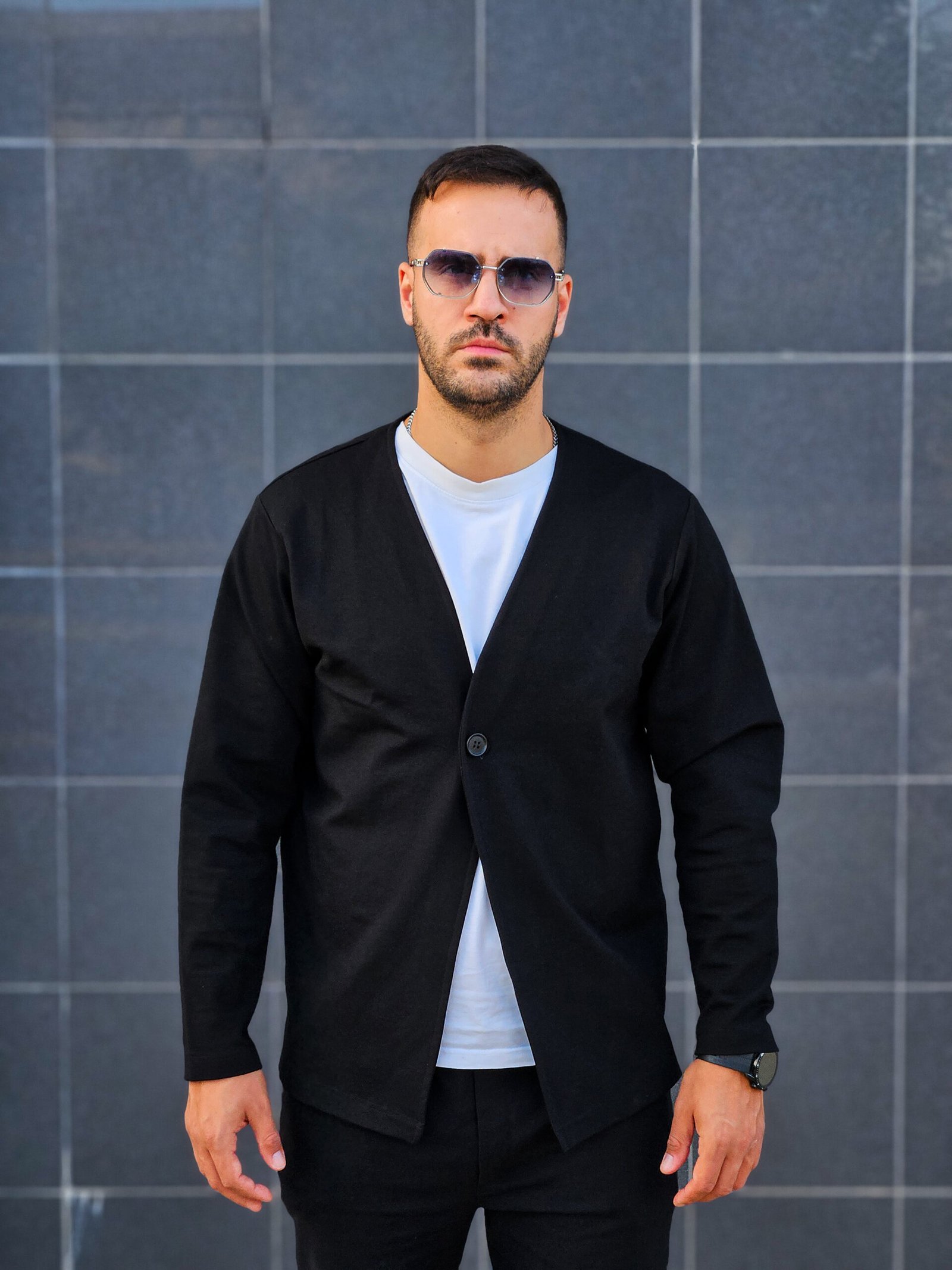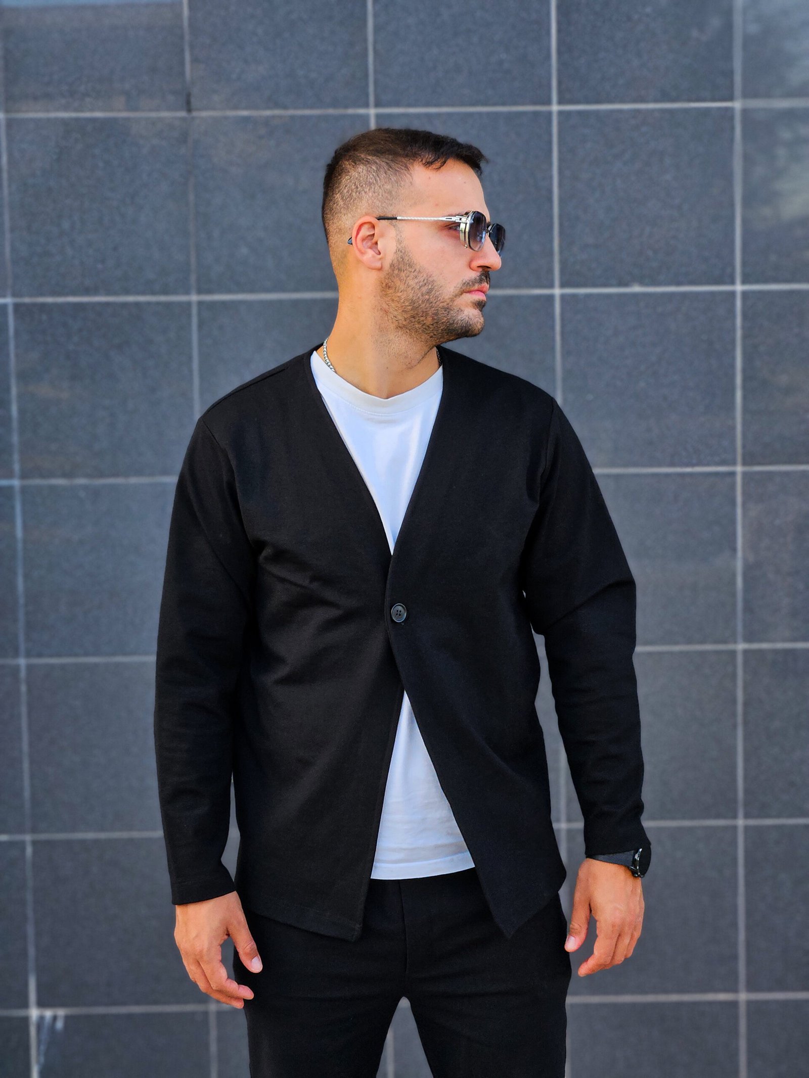 Ανανεώστε το καθημερινό σας στυλ με αυτή τη μοντέρνα ανδρική ζακέτα σε μαύρο χρώμα. Διαθέτει μίνιμαλ σχεδιασμό με V λαιμόκοψη και μονό κουμπί μπροστά, προσφέροντας κομψότητα και ευελιξία σε κάθε εμφάνιση.