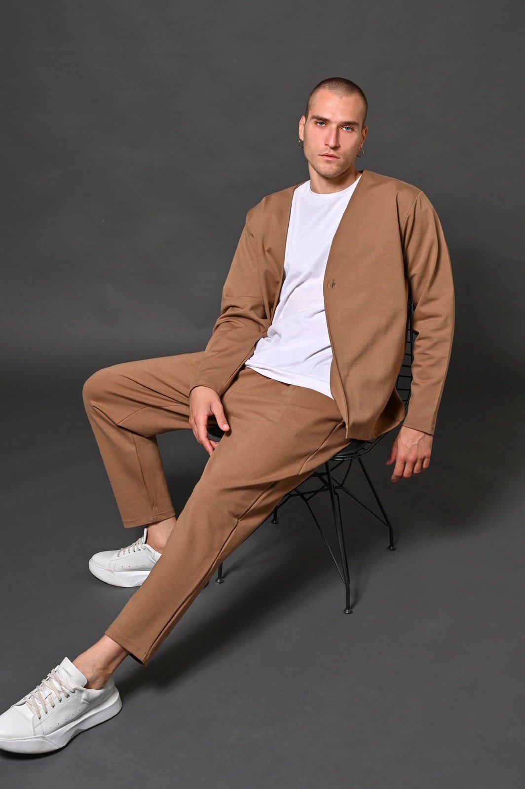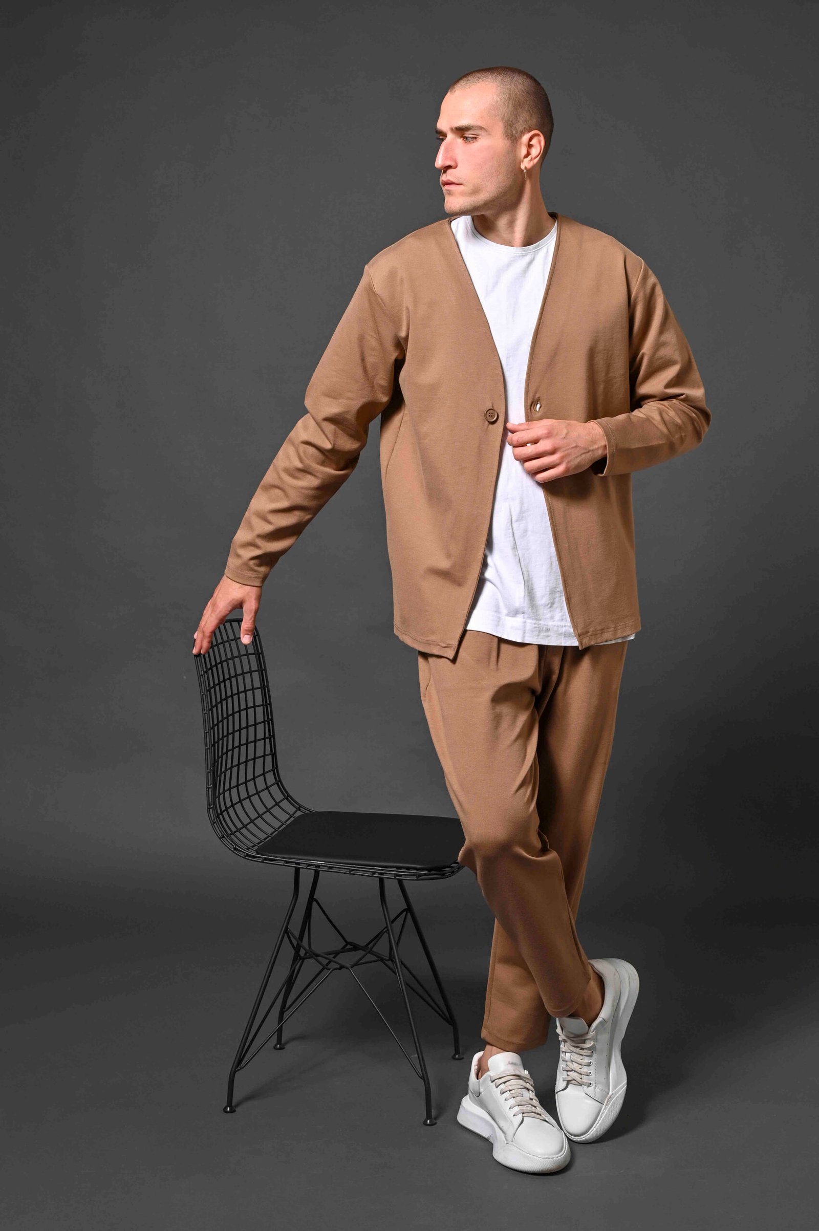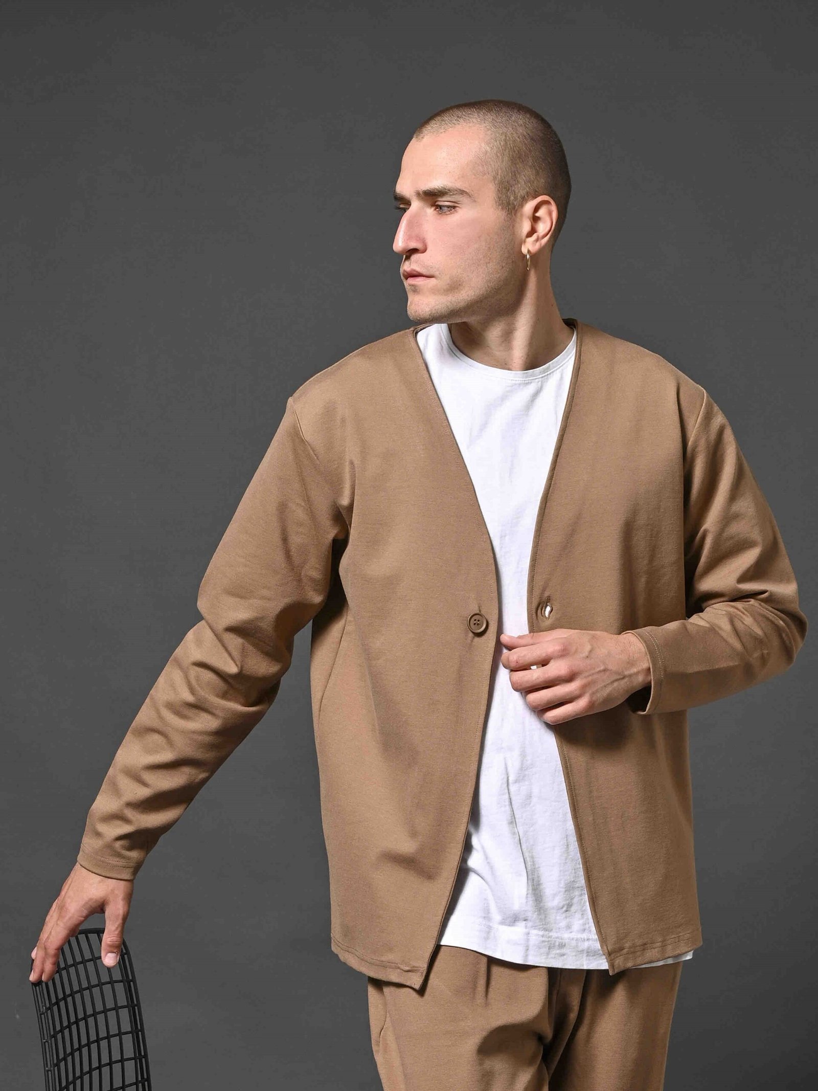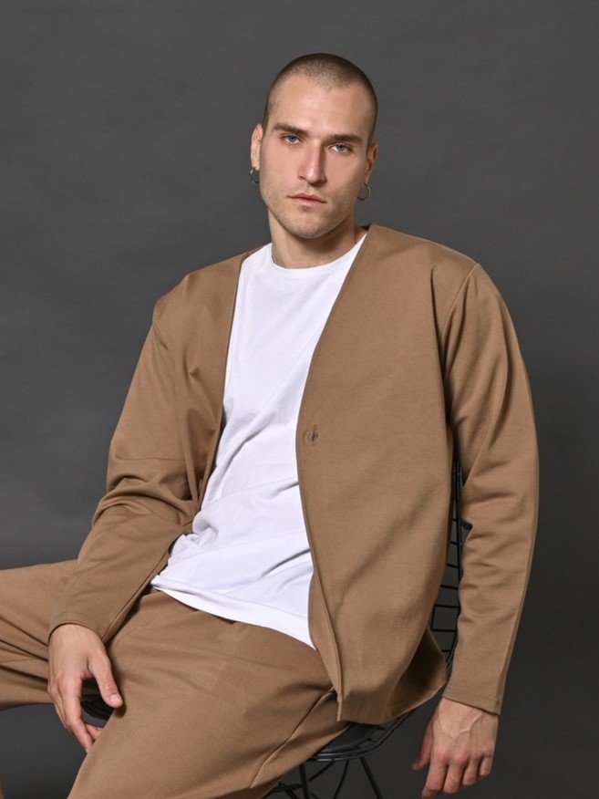 Ανανεώστε το καθημερινό σας στυλ με αυτή τη μοντέρνα ανδρική ζακέτα σε camel χρώμα. Διαθέτει μίνιμαλ σχεδιασμό με V λαιμόκοψη και μονό κουμπί μπροστά, προσφέροντας κομψότητα και ευελιξία σε κάθε εμφάνιση.