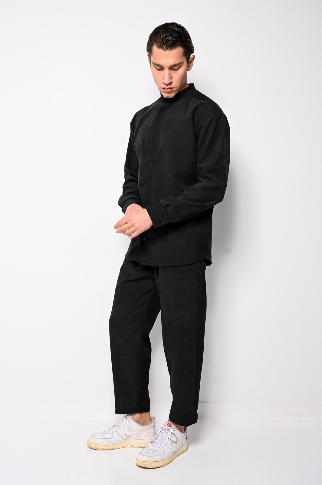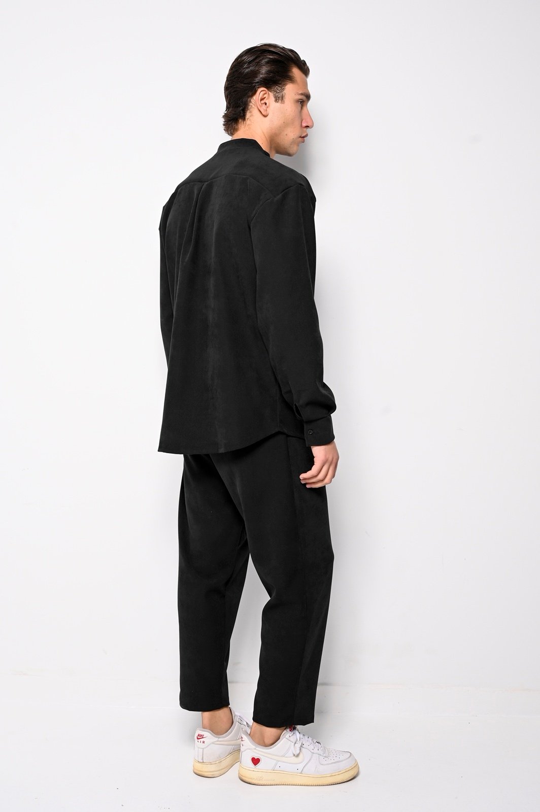 Το σετ περιλαμβάνει πουκάμισο με όρθιο γιακά (Mandarin collar) και κουμπιά μπροστά, καθώς και αντίστοιχο παντελόνι σε χαλαρή αλλά κομψή γραμμή. Η υφή αλκαντάρα προσφέρει premium αίσθηση, εξαιρετική απαλότητα και ανθεκτικότητα.