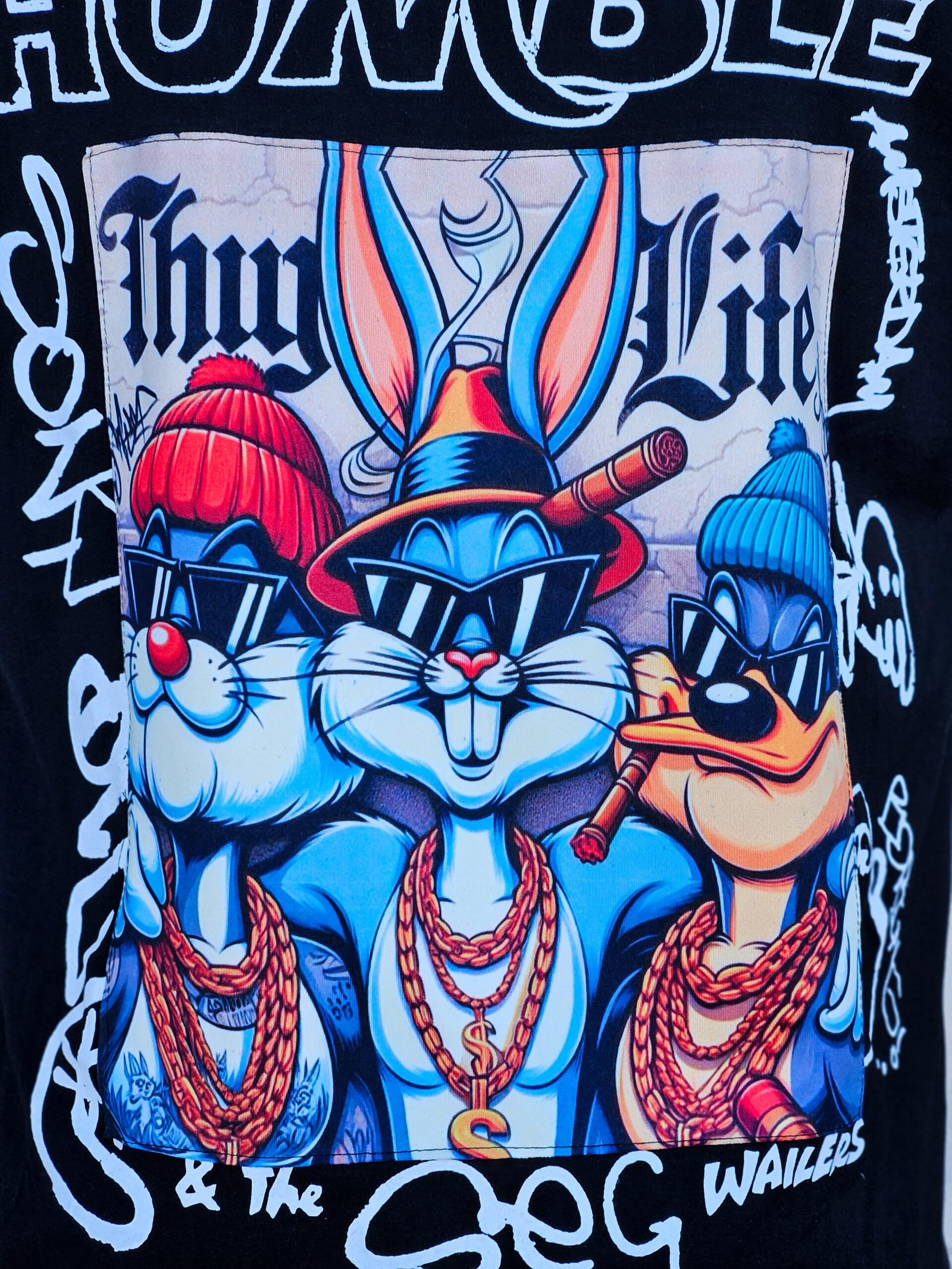 😎 Σχέδιο: Εντυπωσιακό print στην πλάτη με εμβληματικούς cartoon χαρακτήρες σε streetwear στυλ, χρυσές αλυσίδες και graffiti lettering.